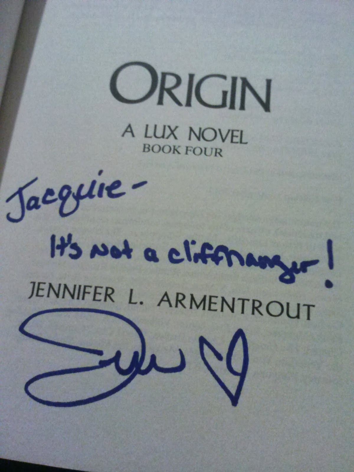 Because when she made her appearance at Decatur Book Fest, she stated during her Q&A that THIS BOOK... ORIGIN... was NOT a CLIFFHANGER!